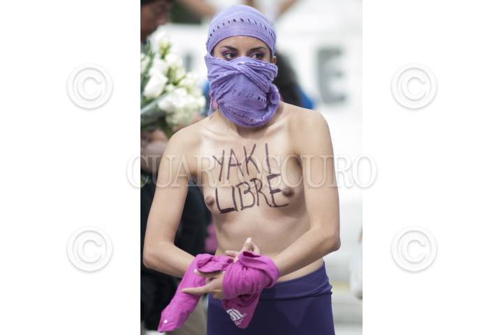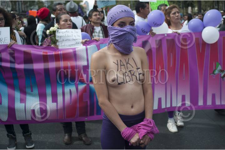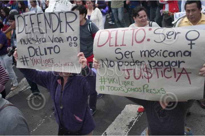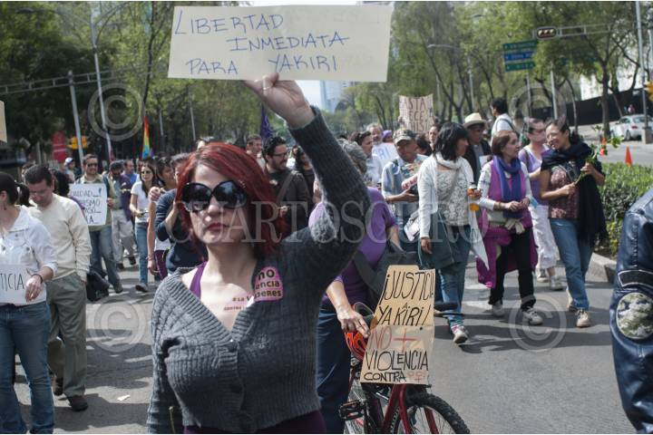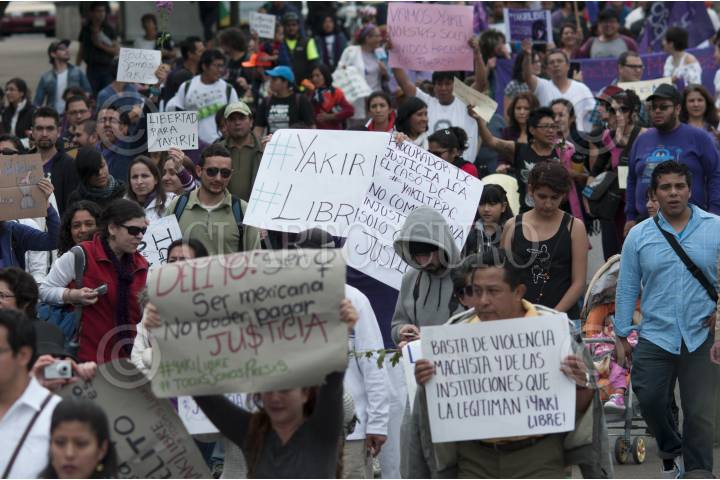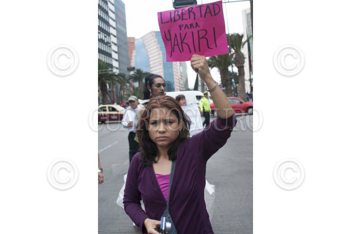 MÉXICO, D.F., 29DICIEMBRE2013.- Activistas, feministas y familiares de Yakiri Rubí Rubio Aupart, la joven acusada de matar a su agresor, marcharon del Ángel de la Independencia al Hemiciclo a Juárez para exigir a las autoridades su inmediata liberación. Yakiri se encuentra presa acusada de asesinar a Miguel Ángel Ramírez Anaya, de 37 años, a quien la joven de 20 señaló como el sujeto que la secuestro y llevó a un hotel para abusar de ella. La Procuraduría General de Justicia capitalina ha señalado que no está comprobado que la joven fue víctima de violación y que testigos afirman que entró por su voluntad al hotel donde entró con Ramírez Anaya. FOTO: IVÁN STEPHENS /CUARTOSCURO.COM