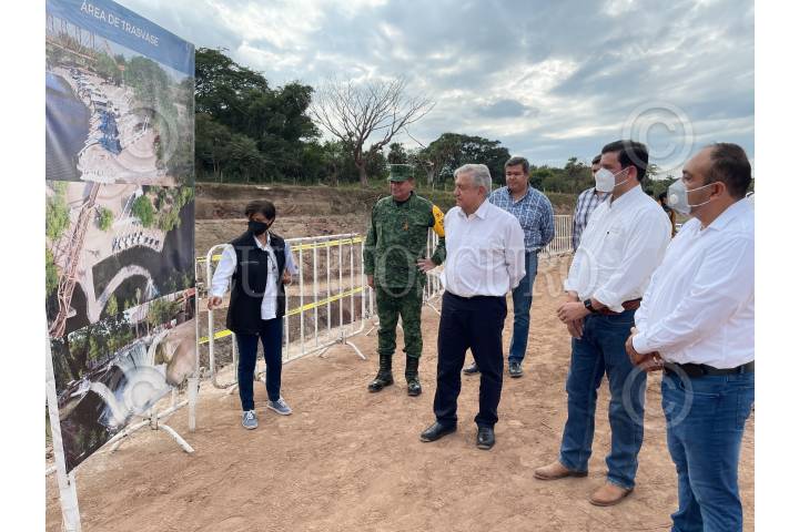 Andrés Manuel López Obrador, presidente de México, durante la Supervisión de la Construcción del Canal Centenario en el Sifón del Canal Centenario en Ruiz, Nayarit. Lo acompañaron: Ricardo Trevilla Trejo, jefe del Estado Mayor Conjunto de la Defensa Nacional; Aarón Mastache Mondragón, subdirector general de Infraestructura Hidroagrícola de la Comisión Nacional del Agua; Iván Hernández Uribe, ingeniero residente de la Secretaría de la Defensa Nacional; Rito Alfonso Galván Zermeño, presidente municipal de Rosamorada y Ernesto Romero Cárdenas, director general del Organismo de Cuenca Lerma Santiago Pacífico.