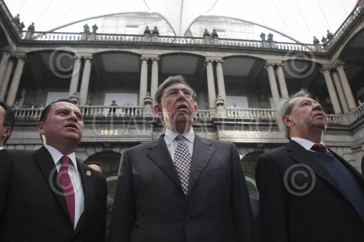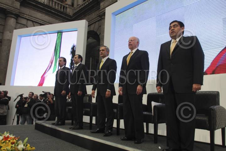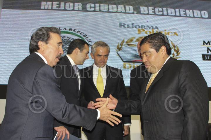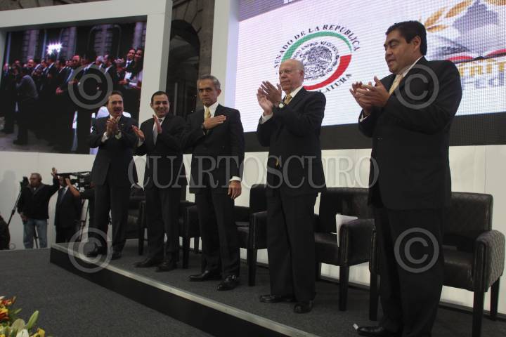 MÉXICO, D.F., 07NOVIEMBRE2012.- Emilio Gamboa, coodinador de los senadores del PRI, Ernesto Cordero, presidente de la mesa directiva del Senado de la República, Miguel Ángel Mancera, Jefe de Gobierno Electo, y Emilio Barbosa, coordinador de los senadores del PRD, durante la presentación del proyecto “Rumbo a la Reforma Política del Distrito Federal”, en Palacio de Minería. FOTO: SAÚL LÓPEZ /CUARTOSCURO.COM