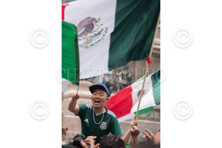 CIUDAD DE MÉXICO, 27JUNIO2018.- Decenas de mexicanos se concentraron en la embajada de Corea del Sur en México para celebrar el pase de la Selección Mexicana a octavos de final de la Copa del Mundo Rusia 2018, obtenida gracias a la victoria de la selección de Corea del Sur 2 a 0 frente a Alemania. FOTO: MARIO JASSO /CUARTOSCURO.COM
