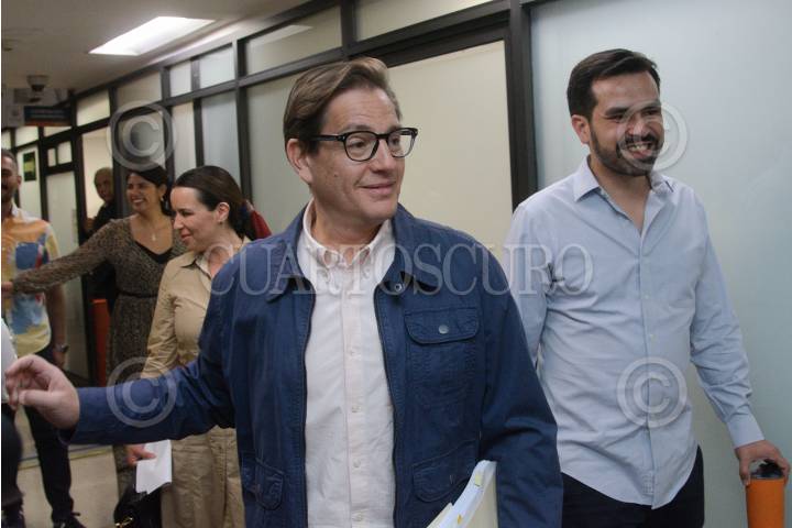 Salomón Chertorivski, y Jorge Álvarez Máynez, diputados de Movimiento Ciudadano, durante su llegada a la reunión de la Junta de Coordinación Política (Jucopo) de la Cámara de Diputados en la que se definirá la ruta para la elección de los nuevos consejeros del Instituto Nacional Electoral (INE).