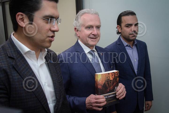Los diputados panistas Jorge Romero; Santiago Creel, y Elías Lixa, durante su llegada a la reunión de la Junta de Coordinación Política (Jucopo) de la Cámara de Diputados en la que se definirá la ruta para la elección de los nuevos consejeros del Instituto Nacional Electoral (INE).
