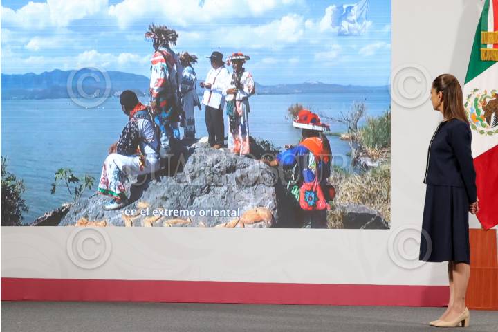 CIUDAD DE MÉXICO, 14JULIO2025.- Claudia Sheinbaum Pardo, Presidenta de México, celebraron la designación de la Ruta Wixárika como Patrimonio de la Humanidad por parte de la Unesco, durante la Mañanera del Pueblo. FOTO: MOISÉS PABLO/CUARTOSCURO.COM