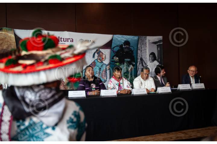 CIUDAD DE MÉXICO, 15JULIO2025.- Diego Prieto Hernández, director general del Instituto Nacional de Antropología e Historia; Andrés Morales, representante de la UNESCO en México; Totupica Candelqrio, representante comunidad Wixárika; Adelfo Regino Montes, director General del Instituto Nacional de Pueblos Indígenas y Claudia Oliva Morales, presidenta del Consejo Nacional para Prevenir la Discriminación (Conapred) encabezaron conferencia de prensa sobre la inscripción de la Ruta Wixárika, a la lista del patrimonio mundial de la Unesco, que se llevó a cabo en el Museo de Antropología. FOTO: ANDREA MURCIA /CUARTOSCURO.COM