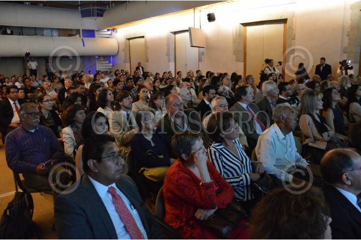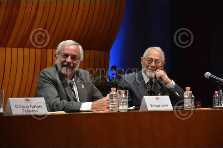 CIUDAD DE MÉXICO, 31MARZO2016.- El físico e investigador, Alejandro Frank, recibió en sesión solemne el reconocimiento que lo acredita como nuevo miembro de El Colegio Nacional, institución que agrupa a los científicos, artistas y literatos más destacados de México con el propósito de preservar y dar a conocer lo más importante de estas ramas. La sesión contó con la presencia de integrantes destacados del colegio como Octavio Navarro Peñalosa, investigador; Enrique Graue Wiechers, rector la UNAM; el médico, Ruy Pérez Tamayo, y el biólogo, Pablo Rudomin. Durante el acto Alejandro Frank expuso al público asistente y a los catedráticos su investigación acerca de la simetría en la naturaleza y los sistemas complejos dentro de ella. En la imagen Enrique Graue y Ruy Pérez Tamayo. FOTO: GALO CAÑAS /CUARTOSCURO.COM