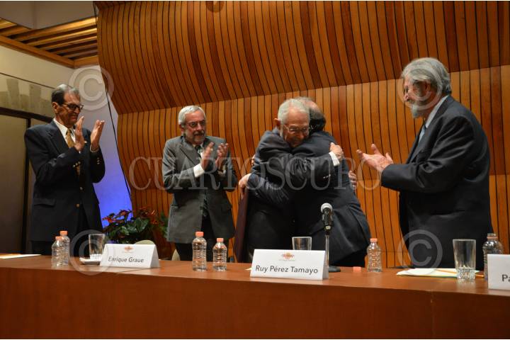 CIUDAD DE MÉXICO, 31MARZO2016.- El físico e investigador, Alejandro Frank, recibió en sesión solemne el reconocimiento que lo acredita como nuevo miembro de El Colegio Nacional, institución que agrupa a los científicos, artistas y literatos más destacados de México con el propósito de preservar y dar a conocer lo más importante de estas ramas. La sesión contó con la presencia de integrantes destacados del colegio como Octavio Navarro Peñalosa, investigador; Enrique Graue Wiechers, rector la UNAM; el médico, Ruy Pérez Tamayo, y el biólogo, Pablo Rudomin. Durante el acto Alejandro Frank expuso al público asistente y a los catedráticos su investigación acerca de la simetríaen la naturaleza y los sistemas complejos dentro de ella. En la imagen Octavio Navarro Peñalosa, Enrique Graue, Ruy Pérez Tamayo abrazando a Alejandro Frank y Pablo Rudomin. FOTO: GALO CAÑAS /CUARTOSCURO.COM