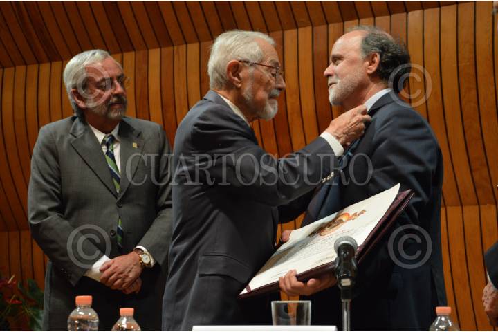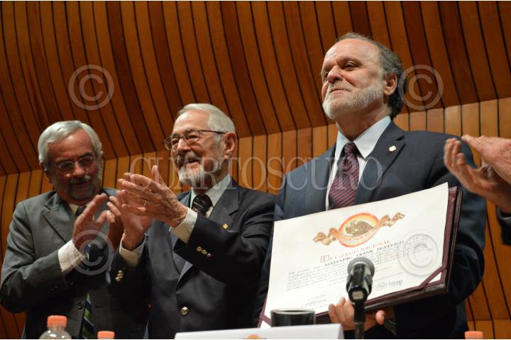 CIUDAD DE MÉXICO, 31MARZO2016.- El físico e investigador, Alejandro Frank, recibió en sesión solemne el reconocimiento que lo acredita como nuevo miembro de El Colegio Nacional, institución que agrupa a los científicos, artistas y literatos más destacados de México con el propósito de preservar y dar a conocer lo más importante de estas ramas. La sesión contó con la presencia de integrantes destacados del colegio como Octavio Navarro Peñalosa, investigador; Enrique Graue Wiechers, rector la UNAM; el médico, Ruy Pérez Tamayo, y el biólogo, Pablo Rudomin. Durante el acto Alejandro Frank expuso al público asistente y a los catedráticos su investigación acerca de la simetría en la naturaleza y los sistemas complejos dentro de ella. En la imagen Enrique Graue, Ruy Pérez Tamayo y Alejandro Frank. FOTO: GALO CAÑAS /CUARTOSCURO.COM