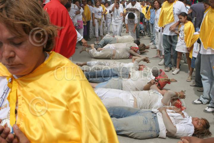 ESPINAZO, MPIO. MINA,NUEVO LEON.19OCTUBRE2006.-Un fiel Fidencista se arrastra de espalda cumpliendo una penitencia. durante el 68 aniversario donde decenas de miles seguidores llegan procedentes del país y la unión americana. José de Jesús Fidencio Constantino Síntora que nacio en Yuriria, Guanajuato el 17 de octubre de 1898 llego a este pueblo el 1923 y desde entonces mostro poderes sobrenaturales para curar enfermedades gratuitamente. FOTO PEDRO VALTIERRA/CUARTOSCURO.COM