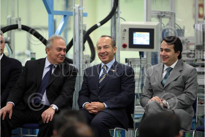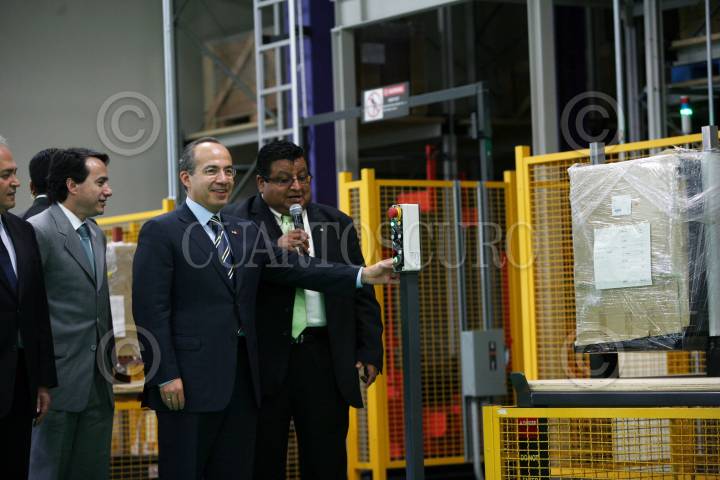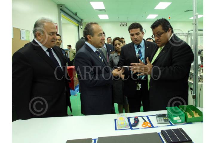 TIJUANA, BAJA CALIFORNIA, 05MARZO2009.- Felipe Calderón, Presidente de México acompañado por José Guadalupe Osuna Millán, Gobernador de Baja California durante la inauguración de la expansión de la empresa Kyocera Mexicana S.A. de C.V. en las instalaciones de la empresa. FOTO: ALFREDO GUERRERO/CUARTOSCURO.COM