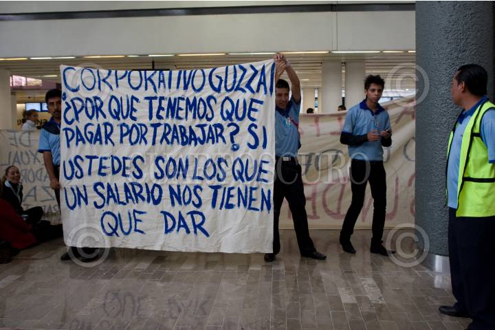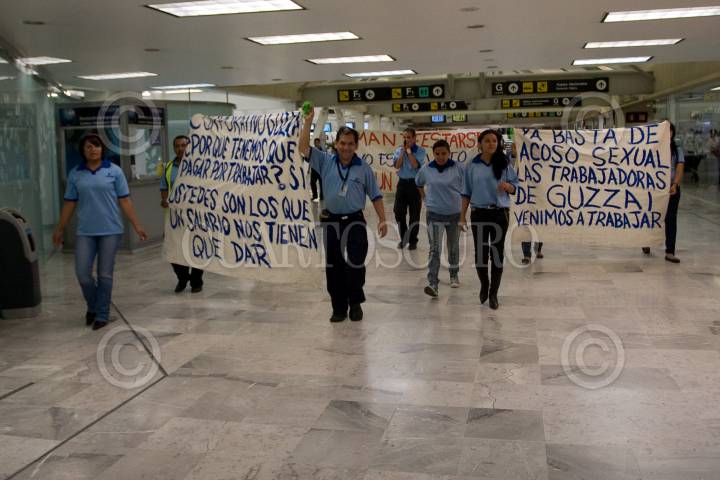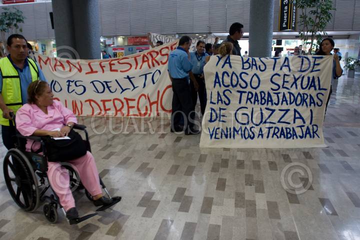 MÉXICO D.F. 19AGOSTO2010.- Personal de la empresa Corporativo de Apoyo Empresarial GUZZAI S.A. protestaron, en el andador del Aeropuerto Internacional de la Ciudad de México, la ya mencionada empresa se dedica a prestar el servicio de apoyo de sillas de ruedas a los pasajeros de las diversas aerolíneas, las exigencias de los trabajadores de esta compañía son el tener las prestaciones de ley, así como su sueldo ya que la empresa cobra el servicio a la aerolíneas sin pagarles salario y cobrándoles a ellos una cuota de 15 pesos para rentarles las sillas de ruedas, su único salario son las propinas que les dejan algunos usuarios. FOTO: GUILLERMO PEREA/CUARTOSCURO.COM