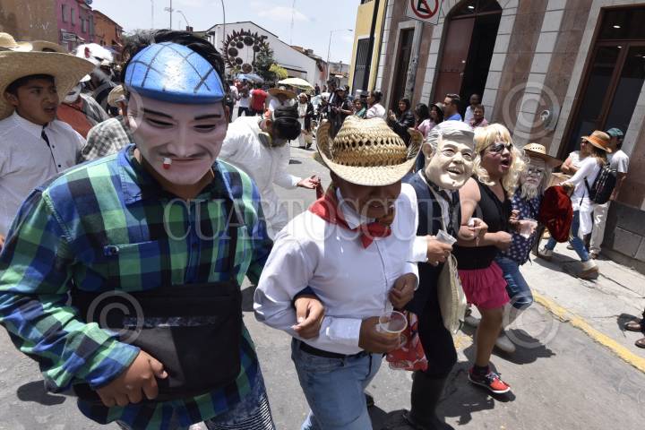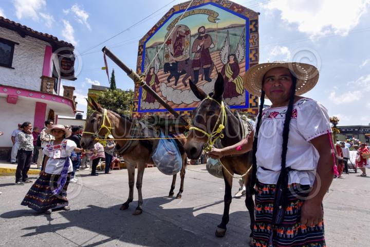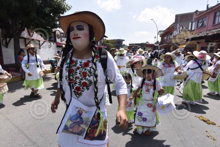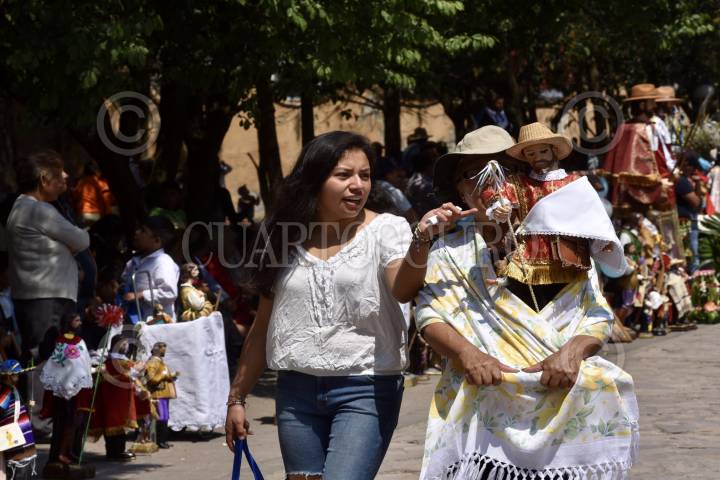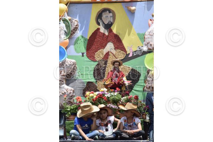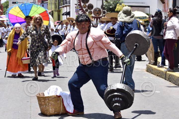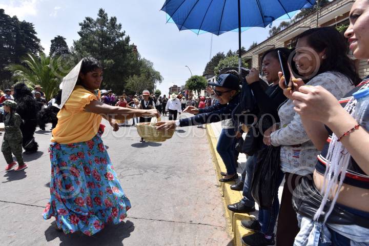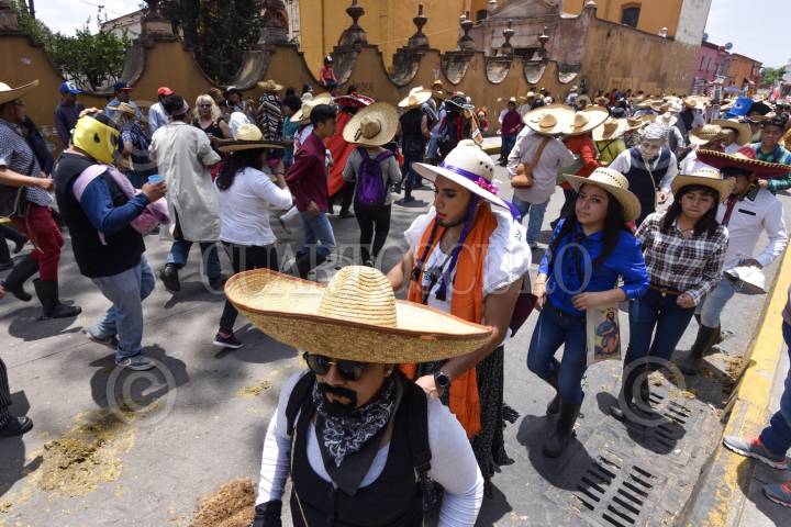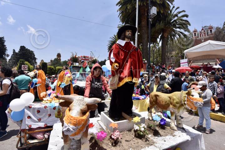 METEPEC, ESTADO DE MÉXICO, 11JUNIO2019.- Como es tradición las calles de este municipio se vistieron de color y música al realizarse el Paseo de la Agricultura en honor a su santo patrono San Isidro Labrador, carros alegóricos, yuntas jalando retablos de semillas, hombres vestidos de tlacualeras bailan por diversas calles, regalando pan, dulces o alguna bebida tradicional como pulque o gatallona. FOTO: CRISANTA ESPINOSA AGUILAR /CUARTOSCURO.COM