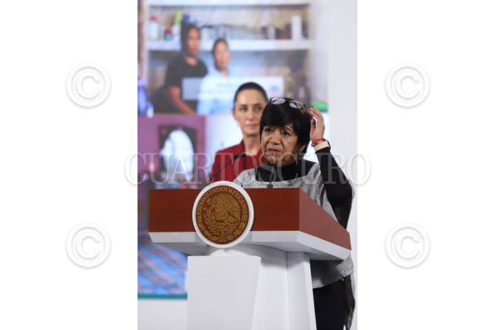 CIUDAD DE MÉXICO, 14JULIO2025.- Edna Vega Rangel, titular de la SEDATU; Claudia Curiel de Icaza, secretaria de Cultura, conversan durante la Mañanera del Pueblo, la primera ofreció información del Programa Nacional de Vivienda y la segunda sobre la designación de la Ruta Wixárika como Patrimonio de la Humanidad por la Unesco. FOTO: MOISES PABLO/CUARTOSCURO.COM