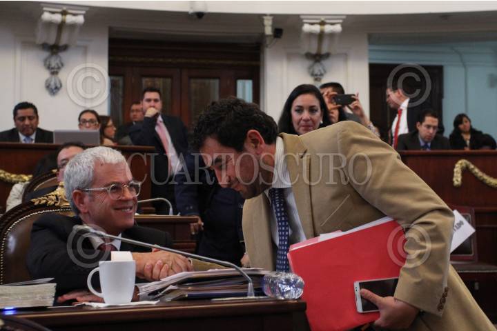 MÉXICO, D.F., 06OCTUBRE2015.- Felipe de Jesús Gutiérrez, titular de la Secretaría de Desarrollo Urbano y Vivienda, compareció ante el pleno de la Asamblea Legislativa del Distrito Federal. A lo largo de 20 minutos presentó su comparecencia ante los asambleístas, mientras se manifestaban, al exterior del recinto, decenas de integrantes de la Asamblea de Barrios y vecinos de la colonia Pencil, quienes exigían el aumento de presupuesto para la colonia. En la imagen, Felipe de Jesús, titular de la Seduvi, estrecha la mano de César Cravioto, coordinador de los diputados de Morena en la ALDF. FOTO: MARÍA JOSÉ MARTÍNEZ /CUARTOSCURO.COM