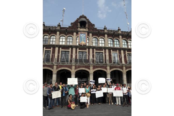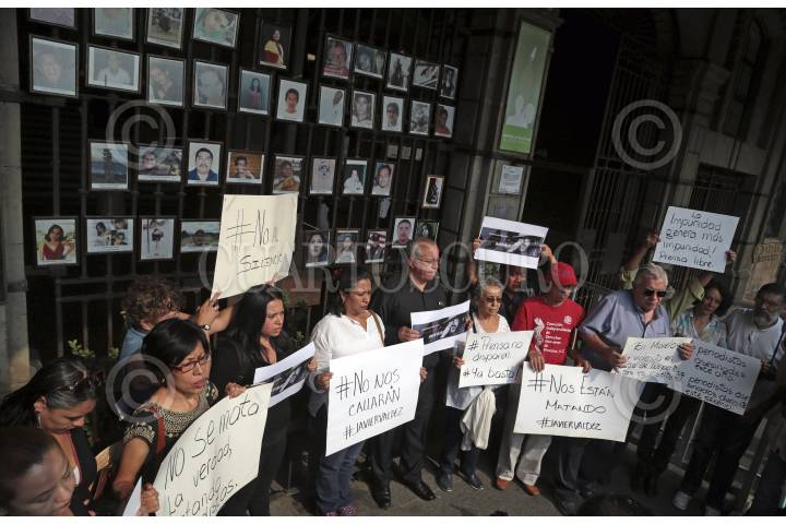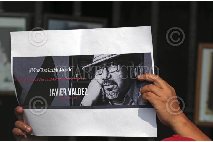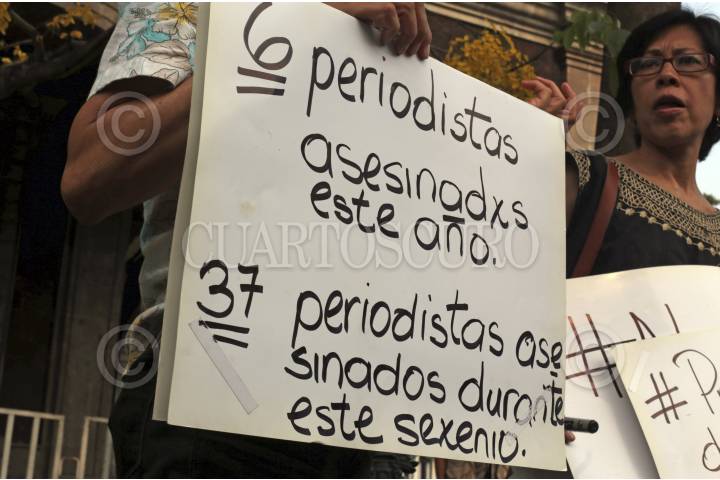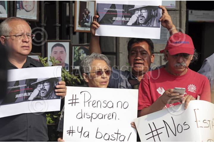 CUERNAVACA, MORELOS, 16MAYO2017.- Periodistas, reporteros, camarógrafos y fotógrafos de prensa se unieron a la protesta nacional por el asesinato del periodista y escritor Javier Valdéz, corresponsal de la Jornada y editor del semanario Riodoce de Sinaloa. En la ofrenda a las víctimas, en el zócalo de la ciudad, los trabajadores de los medios de comunicación exigieron a las autoridades federales que atiendan las agresiones en contra del gremio en el estado. En este año seis comunicadores han sido asesinados y van 37 en el presente sexenio. FOTO: MARGARITO PÉREZ RETANA /CUARTOSCURO.COM