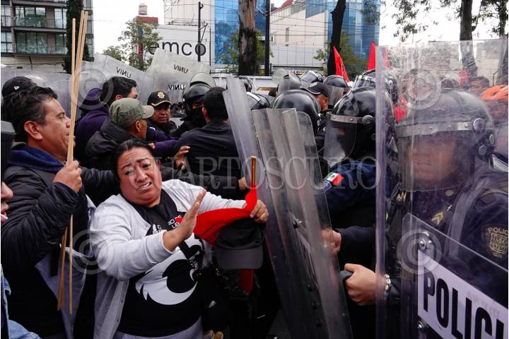 CIUDAD DE MÉXICO, 01DICIEMBRE2023.- Integrantes del Sindicato de Trabajadores del Colegio de Bachilleres, realizaron una protesta en Calzada de Tlalpan a la altura de las oficinas del SINTCB. Tras un bloqueo intermitente policías capitalinos desplegaron a los inconformes con distintos conatos de pelea. FOTO: ROGELIO MORALES /CUARTOSCURO.COM