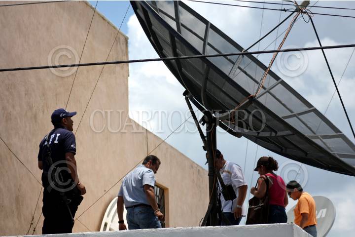 MÉRIDA, YUCATÁN, 23JUNIO2010.- Agentes de la AFI y de la SSP realizaron un operativo en una sucursal de “SKY”, ubicada en la calle 7 # 375 de la colonia Residencial Pensiones, por presunto comercio ilegal de señal de televisión. En el operativo participaron aproximadamente siete patrullas antimotines que rodearon el lugar, así como peritos de la AFI que fotografiaron las 7 antenas que se encontraban en la parte superior del local y sus oficinas. FOTO: FRNACISCO BALDERAS/CUARTOSCURO.COM