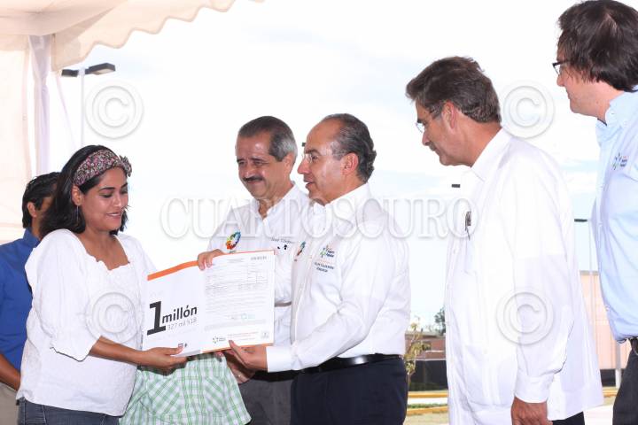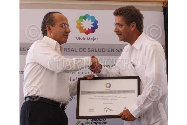 SAN LUIS POTOSÍ, SAN LUIS POTOSÍ 03AGOSTO2011.- Felipe Calderón Hinojosa, presidente de México, acompañado de Fernando Toranzo, gobernador del estado, durante el evento de cobertura universal de salud que se llevó a cabo en la entidad. FOTO: ALFREDO GUERRERO/CUARTOSCURO.COM