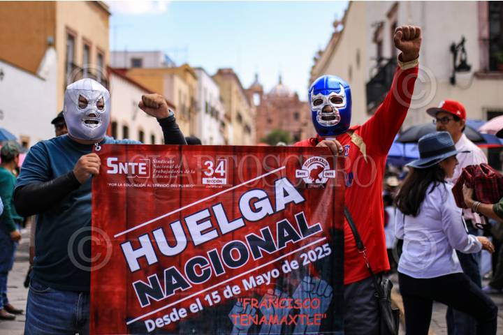 ZACATECAS, ZACATECAS, 04JUNIO2025.- Maestros del Sindicato Nacional de Trabajadores de la Educación sección 34 y de la Coordinadora Nacional de Trabajadores de la Educación sección 58 realizaron una marcha por las principales calles del centro histórico como parte de la lucha a nivel nacional por la abrogación de la Ley del ISSSTE de 2007. La movilización concluyó en el Congreso del Estado, donde exigieron que los legisladores locales se pronuncien en contra de dicha ley. FOTO: ADOLFO VLADIMIR /CUARTOSCURO.COM