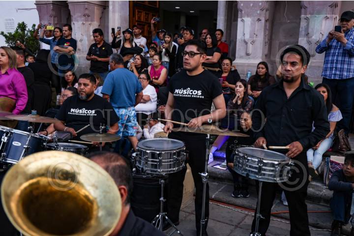 ZACATECAS, ZACATECAS, 05 JUNIO 2025.- El colectivo "Músicos Zacatecanos Unidos" realizó un concierto en la Explanada del Congreso del Estado en apoyo al plantón del magisterio de las secciones 34 y 58, quienes participan en la jornada nacional por la abrogación de la Ley del ISSSTE de 2007. FOTO: ADOLFO VLADIMIR / CUARTOSCURO.COMFOTO: ADOLFO VLADIMIR /CUARTOSCURO.COM