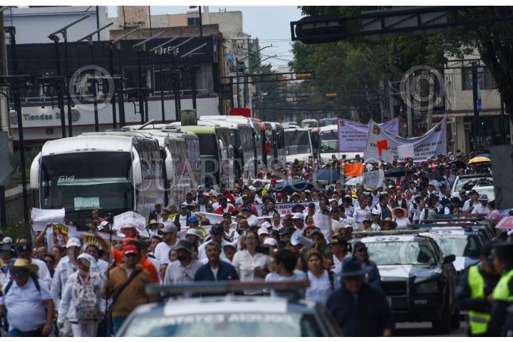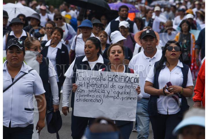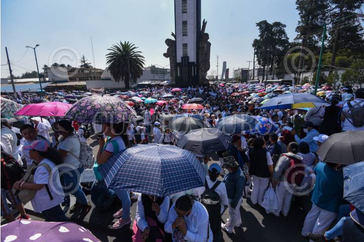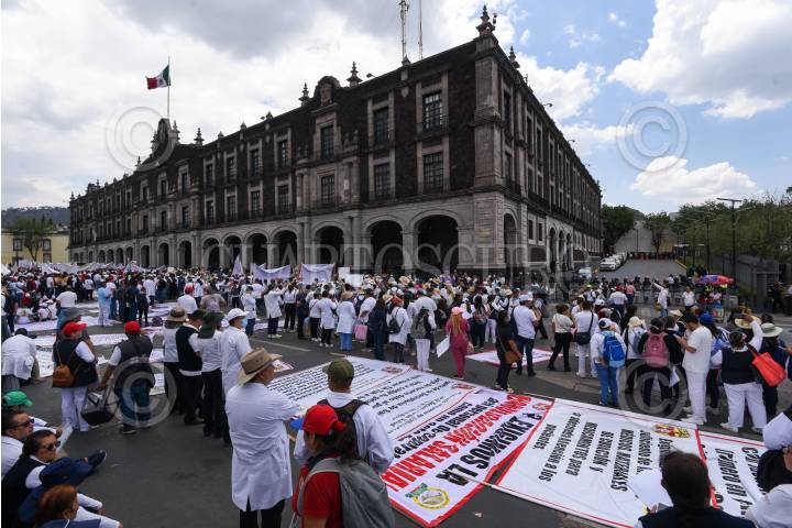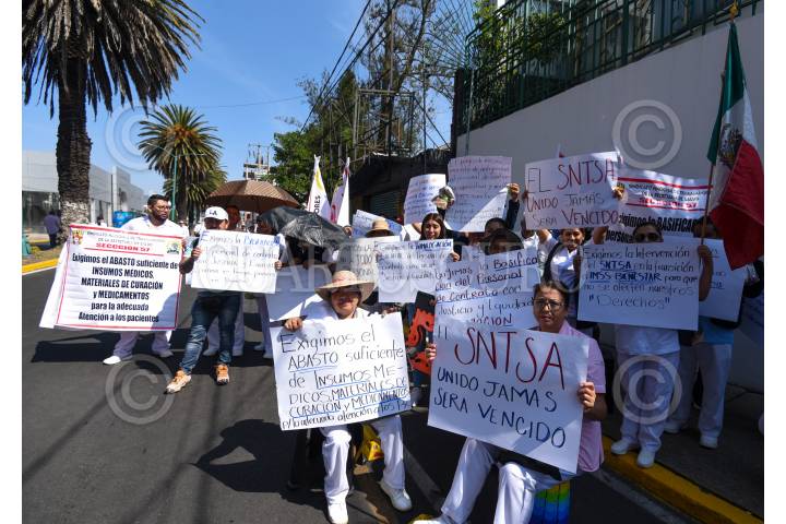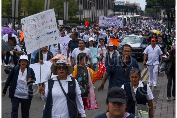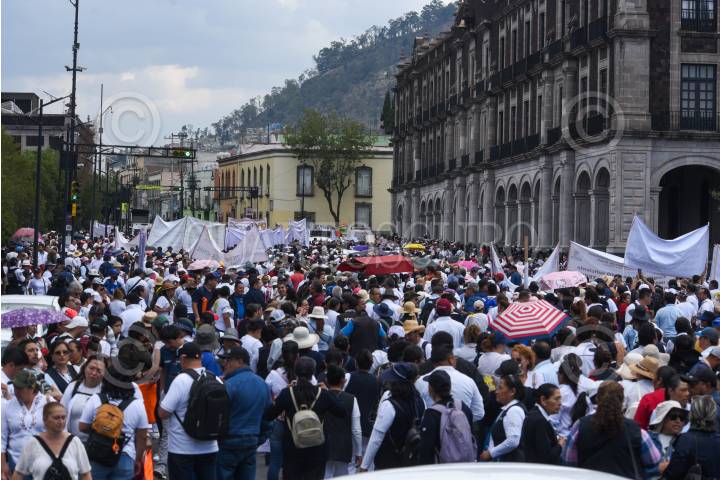 TOLUCA, ESTADO DE MÉXICO, 10JUNIO2024.- Más de 6 mil trabajadores de salud integrantes del Sindicato Nacional de Trabajadores de la Secretaría de Salud (SNTSA) marcharon por las principales calles de Toluca exigiendo la renuencia de la Secretaría de Salud estatal Macarena Montoya Olvera, basificación de personal de contrato, sueldos dignos, insumos médicos, medicamentos, materiales de curación para brindar una buena atención a los pacientes, partieron del Monumento a la Bandera y llegaron a Palacio de Gobierno. FOTO: CRISANTA ESPINOSA AGUILAR /CUARTOSCURO.COM