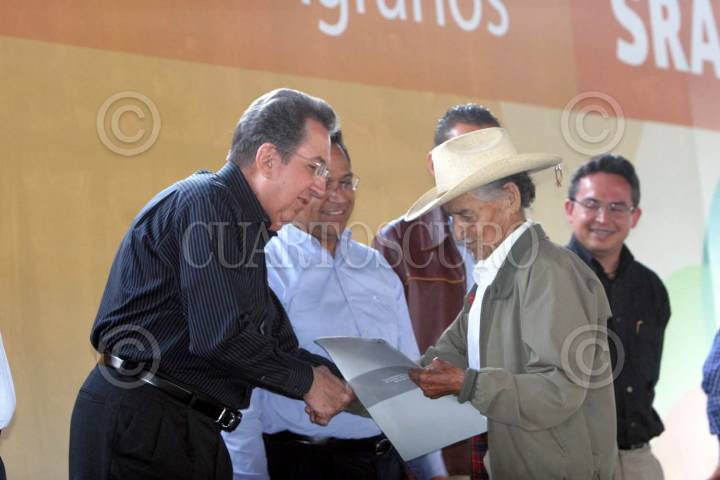 GUANAJUATO, GUANAJUATO, 27AGOSTO2008.- En gira de trabajo por este estado, el titular de la Secretaria de la reforma Agraria, Abelardo Escobar Prieto, junto con el gobernador del estado, Juan Manuel Oliva Ramírez, entrego documentos agrarios que dan certeza jurídica en la tenencia de la tierra a más de 2 mil 600 familias de ejidos de los municipios de Abasolo, Manuel Doblado, Cuerámo, Huanimaro, Pueblo Nuevo, Valle de Santiago y Pénjamo. FOTO: FEDERICO GUERRERO/CUARTOSCURO.COM