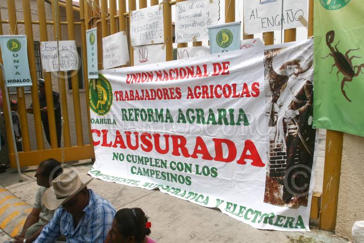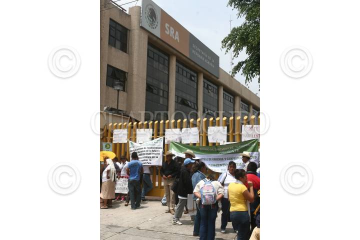 MÉXICO, D.F., 18AGOSTO2009.- Campesinos agrupados a la Unión General de Obreros y Campesinos de México (UGOCM), Union Nacional de Trabajadores Agrícolas (UNTA), Confederación Agrarista Mexicana (CAM) y Alianza Campesina del Noroeste (Alcano), bloquearon desde temprano en la entrada de la SRA para impedir el acceso al personal de la dependencia, demandando no disminuir el presupuesto de programas de la Mujer en el Sector Agrario (Promusag) y Fondo de Apoyo a Proyectos Productivos en Núcleos Agrarios (Fappa). FOTO: SAÚL LÓPEZ/CUARTOSCURO.COM