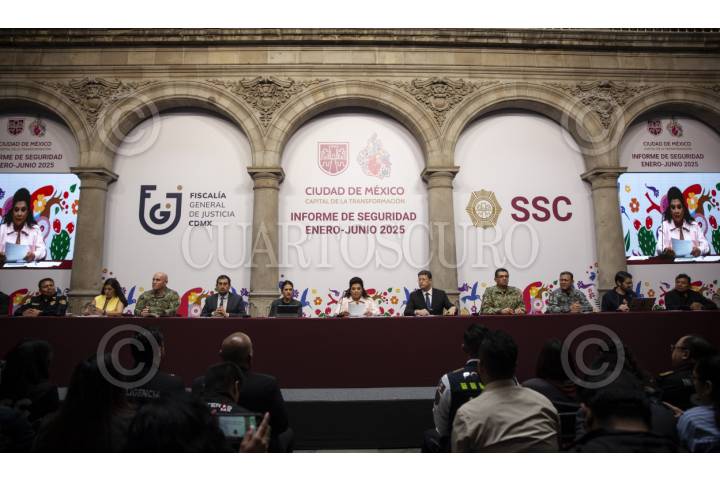 CIUDAD DE MÉXICO, 08JULIO2025.- Clara Brugada, Jefa de Gobierno, acompañada de Bertha Alcalde Luján, Fiscal general de justicia; Pablo Vázquez Camacho, secretario  de Seguridad Ciudadana (SSC),  y el gabinete de seguridad encabezaron el Informe de Seguridad, que se llevo a cabo en el Antiguo Palacio del Ayuntamiento. FOTO: ANDREA MURCIA /CUARTOSCURO.COM
