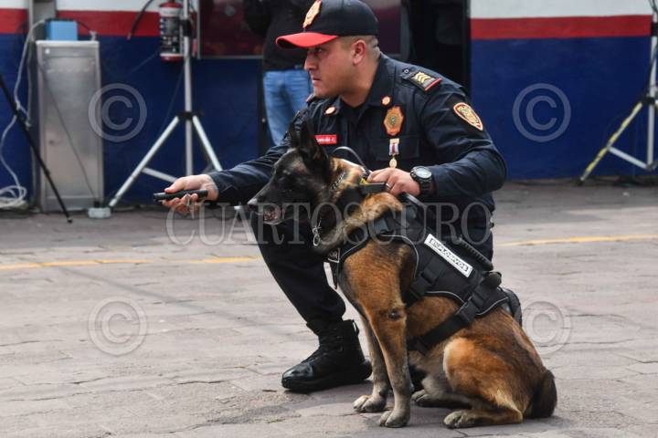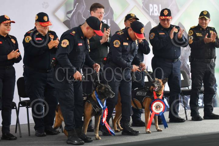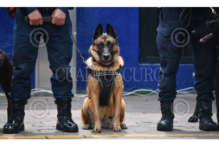 CIUDAD DE MÉXICO, 11JULIO2025.- Ceremonia conmemorativa por el 28° Aniversario de la Unidad Canina de la Policía Bancaria e Industrial (PBI), realizada en las instalaciones del Centro de Formación de dicha corporación. En el marco del aniversario, fueron presentados tres nuevos integrantes que reforzarán la Unidad Canina: "Zory", especializada en búsqueda de personas en estructuras colapsadas: “Balto", entrenado en detección de narcóticos, y "Kali", con formación en la identificación de explosivos. También se realizó una emotiva despedida para los ejemplares “Molly” y “Héctor”, quienes concluyen su etapa activa tras siete y ocho años de servicio, respectivamente. FOTO: MARIO JASSO/CUARTOSCURO.COM
