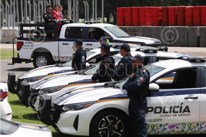 CIUDAD DE MÉXICO, 24JULIO2025.- La jefa de gobierno de la capital, Clara Brugada, acompañada del secretario y subsecretario de Seguridad, Pablo Vázquez y Elpidio de la Cruz "Jefe Álamo", abordaron una de las nuevas patrullas de la SSC, para observar los demás vehículos con los que contarán los policías de la ciudad para vigilar las 16 demarcaciones. FOTO: DANIEL AUGUSTO/ CUARTOSCURO.COM
