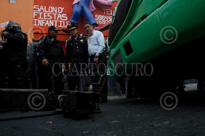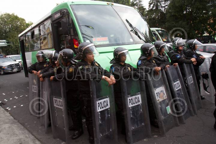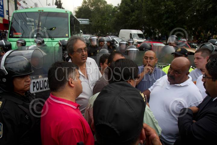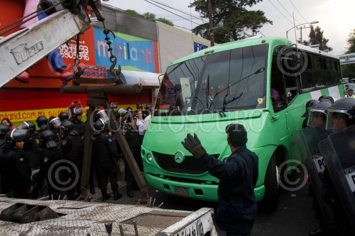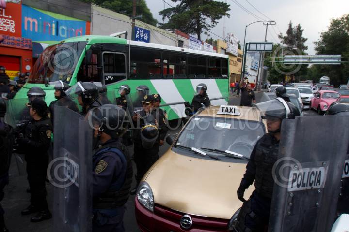 MÉXICO, D.F. 06AGOSTO2013.- Leugo de implementar el operativo Pasajero Seguro, en colaboración con la Secretaría de Seguridad Pública capitalina y la Procuraduría General de Justicia del DF, así como el Instituto de Verificación Administrativa (Invea) en el cruce de Periférico y Barranca del Muerto, varios operadores de camiones decidieron cerrar Barranca del Muerto, luego de que fueran detenidos dos de sus unidades por falta de documentación. Al lugar llegaron granaderos para levantar las unidades multadas. FOTO: JUAN PABLO ZAMORA /CUARTOSCURO.COM
