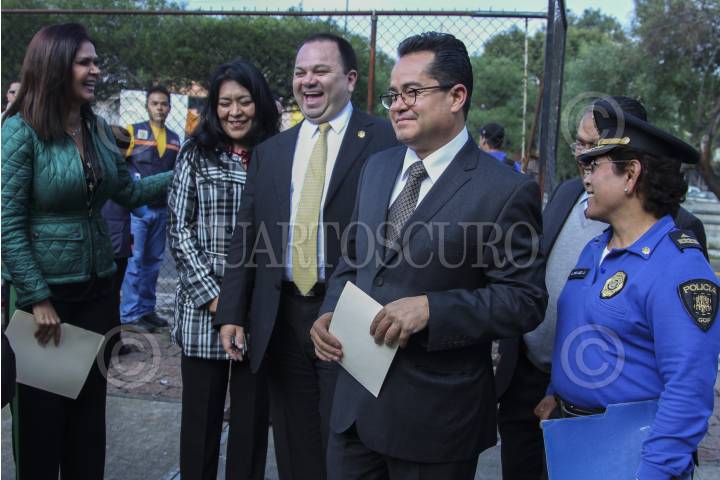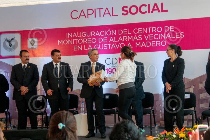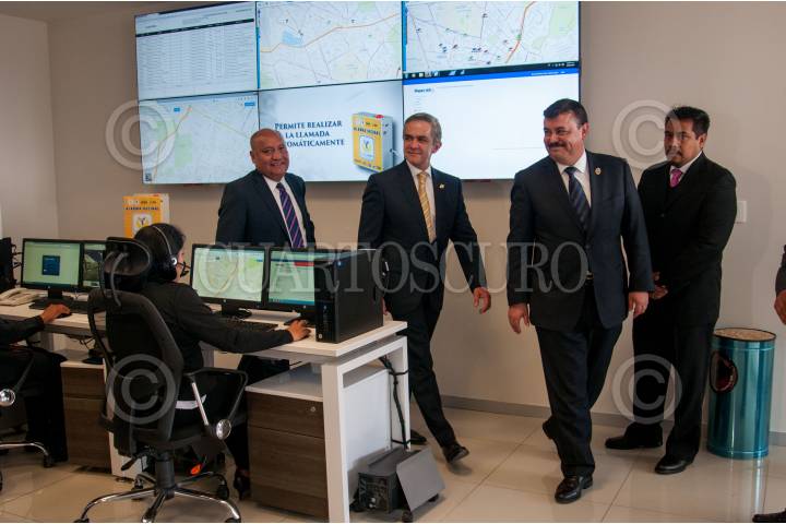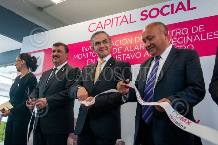 MÉXICO, D.F., 12FEBRERO2015.- Miguel Ángel Mancera, jefe de gobierno capitalino, Hiram Almeida, titular de la SSP DF, e Isidro Corro, titular de la Delegación Gustavo A. Madero, encabezaron la inauguración del programa de Alarmas Vecinales y el centro de Monitoreo de la delegación Gustavo A. Madero, ubicado junto a la casa de huéspedes "La Villa", frente a la explanada delegacional. FOTO: DIEGO SIMÓN SÁNCHEZ /CUARTOSCURO.COM