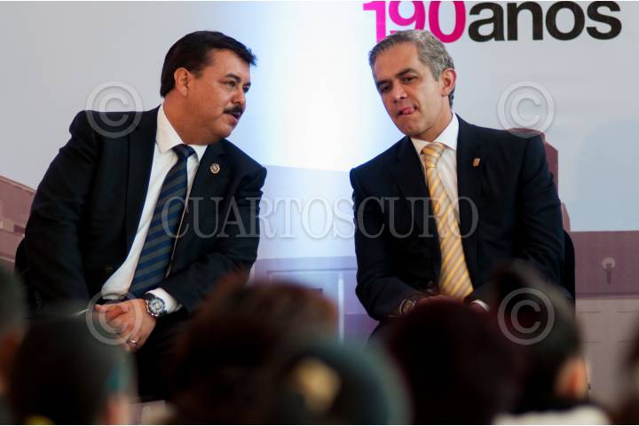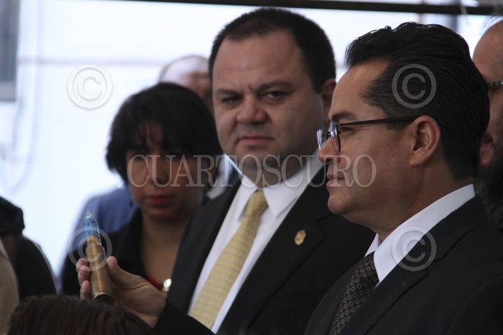 MÉXICO, D.F., 08JULIO2014.- Jesús Rodríguez Almeida, Secretario de Seguridad Pública junto a Eduardo Santillán Pérez, Delegado de Álvaro Obregón durante la puesta en marcha del Programa "Por tu Familia Desarme Voluntario". FOTO: ENRIQUE ORDÓÑEZ /CUARTOSCURO.COM