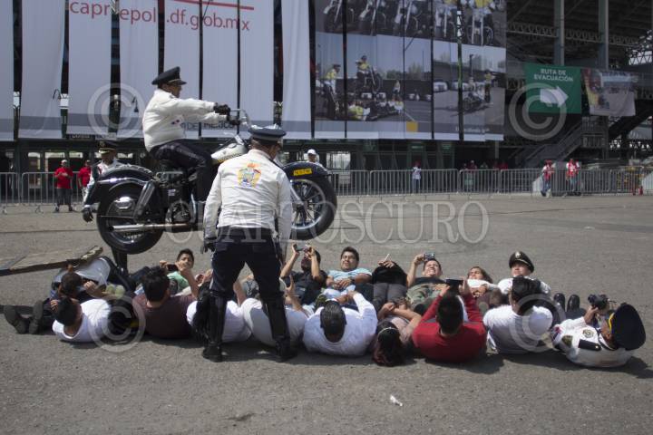 MÉXICO, D.F., 26MARZO2014.- Integrantes del cuerpo acrobático de motociclismo de la Secretaria de Seguridad Pública del Distrito Federal, realizaron una exhibición a la cual asistió Jesús Rodríguez Almeida, Secretario de Seguridad Pública del DF. FOTO: ENRIQUE ORDÓÑEZ /CUARTOSCURO.COM