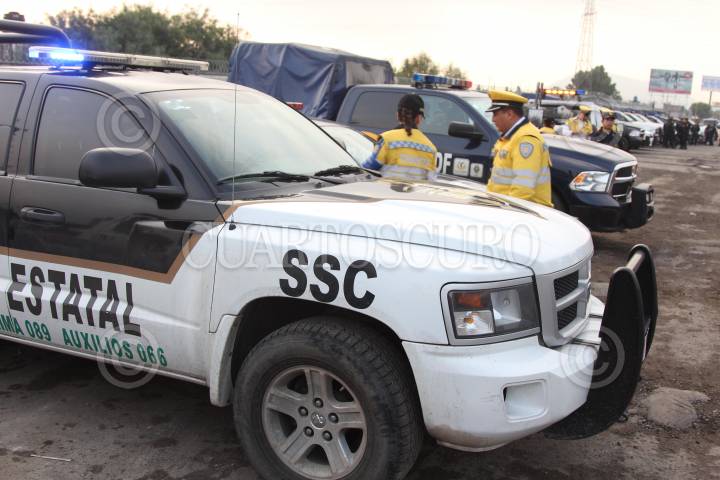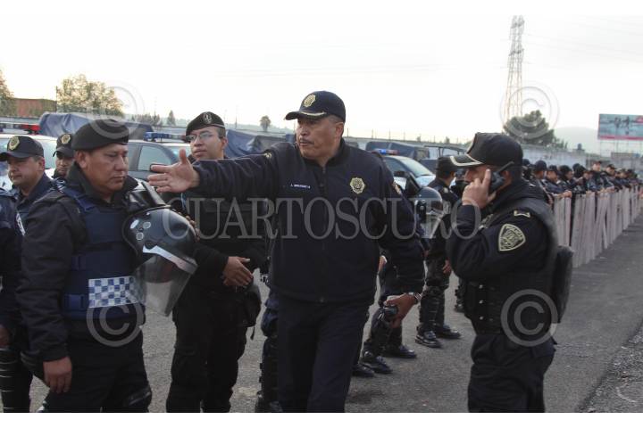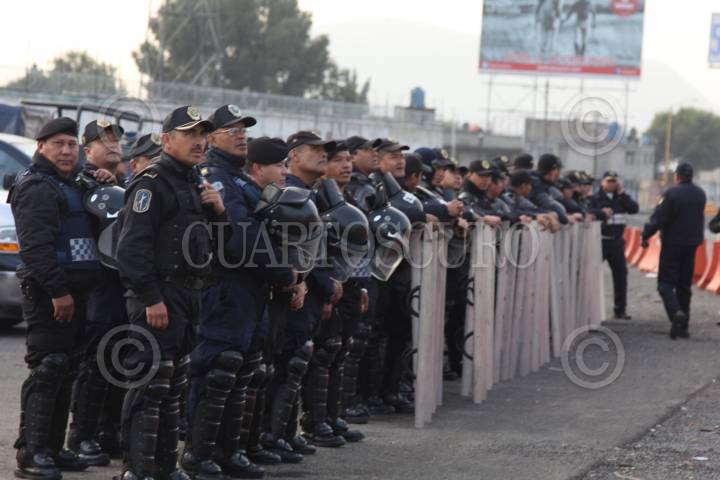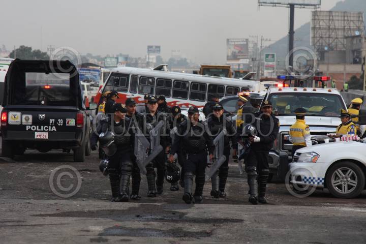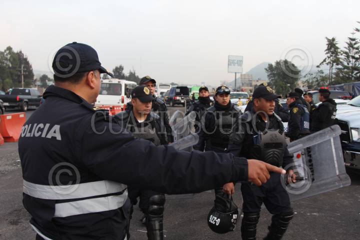 MÉXICO, D.F., 11JULIO2014.- Granaderos de la SSP-DF resguardan los accesos al Distrito Federal tras la convocatoria en las redes sociales de bloquear los accesos a la ciudad y a la zona conurbada del Estado de México en protesta contra la nueva disposición de la Secretaria del Medio Ambiente del programa “Hoy No Circula”. FOTO: SAÚL LÓPEZ /CUARTOSCURO.COM