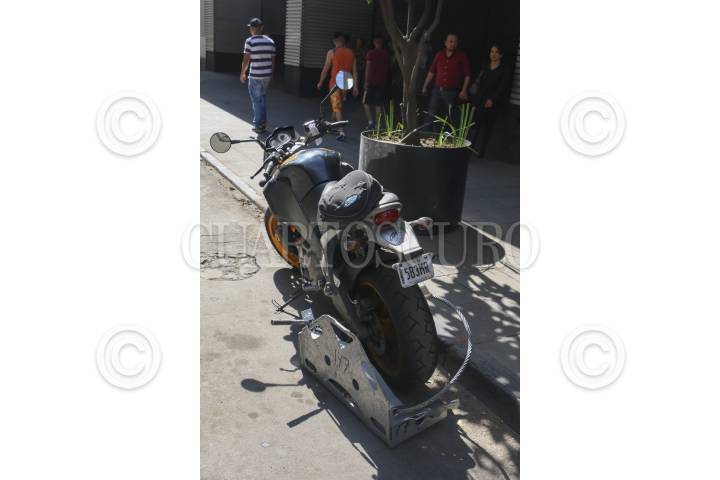 MÉXICO, D.F., 09ENERO2016.- Una motocicleta mal estacionada fue sancionada con un inmovilizador de los denominados "arañas" en la calle de centro histórico. FOTO: SAÚL LÓPEZ /CUARTOSCURO.COM