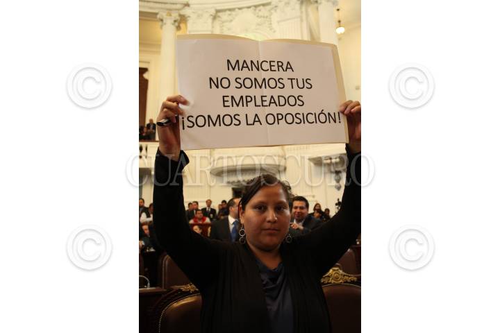 MÉXICO, D.F., 08OCTUBRE2015.- En la imagen, Raúl Flores, dirigente del PRD D.F. desplegó una pancarta que hace alusión a la impuntualidad de algunos diputados de Morena, quienes durante la comparecencia protestaron en contra de Hiram Almeida, secretario de Seguridad Pública. FOTO: MARÍA JOSÉ MARTÍNEZ /CUARTOSCURO.COM