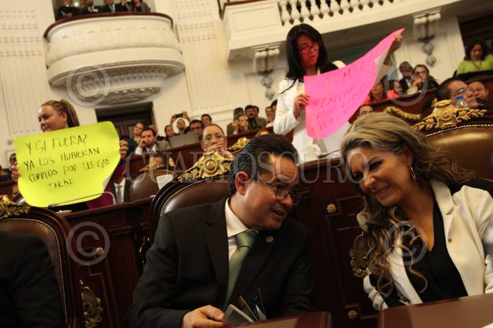 MÉXICO, D.F., 08OCTUBRE2015.- Diputados de Morena alzaron pancartas para protestar durante la comparecencia de Hiram Almeida, secretario de Seguridad Pública. En la imagen, Leonel Luna, coordinador de bancada del PRD y Nora Arias durante la protesta de los diputados de Morena. FOTO: MARÍA JOSÉ MARTÍNEZ /CUARTOSCURO.COM