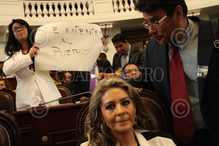 MÉXICO, D.F., 08OCTUBRE2015.- Diputados de Morena alzaron pancartas para protestar durante la comparecencia de Hiram Almeida, secretario de Seguridad Pública. Al frente, la diputada Nora Arias, detrás de una de las pancartas que fueron desplegadas en contra de los diputados de Morena que protestaron durante la comparecencia. FOTO: MARÍA JOSÉ MARTÍNEZ /CUARTOSCURO.COM