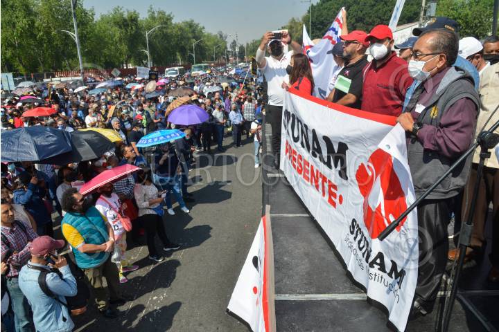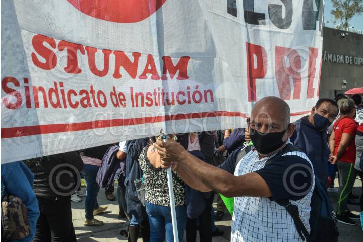 Integrantes del Sindicato de Trabajadores de la Universidad Nacional Autónoma de México (STUNAM) se manifestaron al exterior de la Cámara de Diputados en la que solicitan la revisión de la Contrato Colectivo de Trabajo e Incremento Salarial del 20 por ciento.