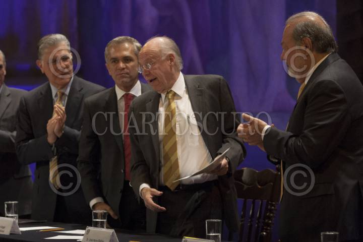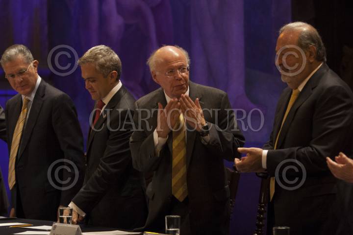 MÉXICO, D.F., 25FEBRERO2013.-Rafaél Moreno Valle, director del Consejo Directivo de la Fundación UNAM, Miguel Angel Mancera, , jefe de Gobierno del D.F., José Narro Robles, rector de la UNAM, y el empresario Carlos Slim durante la inaguración del Programa Cultural "Su sede en el Centro" en el Antiguo Colegio de San Idelfonso. FOTO: JUAN PABLO ZAMORA /CUARTOSCURO.COM