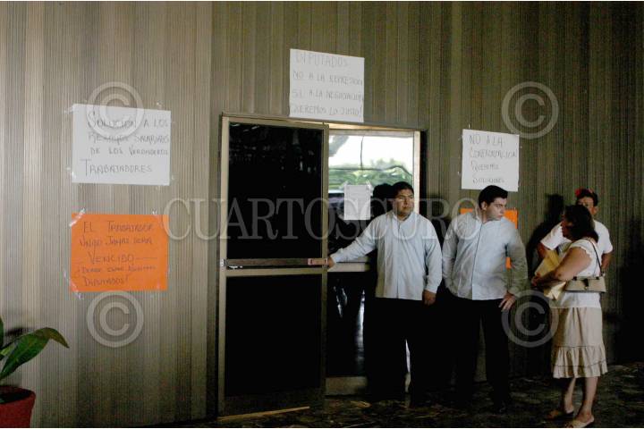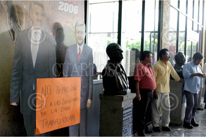 VILLAHERMOSA, TABASCO, 25ABRIL2006.- Trabajadores sindicalizados del SUSET en el H. Congreso del Estado se manifestaron en paro de labores en el vestibulo de dicho organo legislativo, en donde exigen solución a los rezagos salariales. Estos empleados representan al menos el 70 por ciento de la base laboral y aunque el paro es ilegitimo, prometen continuar en su lucha por dignificación ante la cerrazon de los diputados. FOTO: Marco Polo Guzmán/CUARTOSCURO.COM