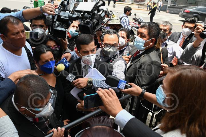 Teófilo Benítez, abogado junto a Raúl Reyes y María Guadalupe Lezama, padres del menor presuntamente violentado sexualmente por Saúl Huerta, diputado de Morena, acudieron al acceso principal del Palacio Legislativo de San Lázaro en espera de la discusión del desafuero del diputado durante sesión extraordinaria de la Cámara de Diputados.