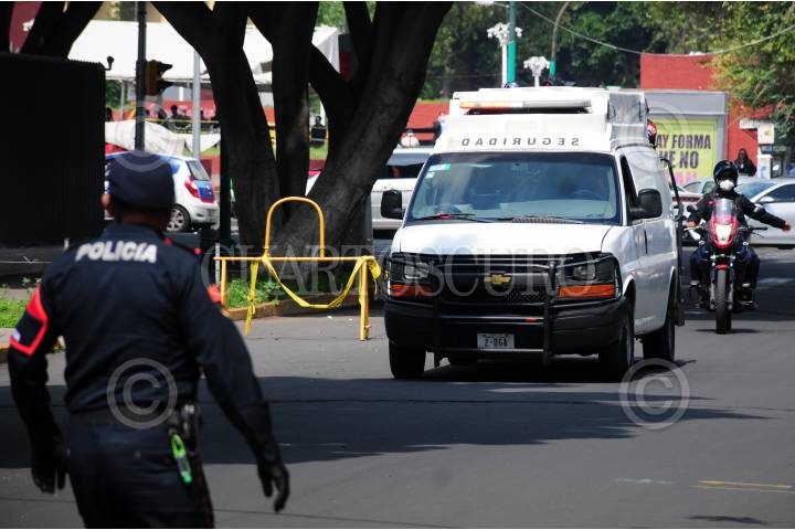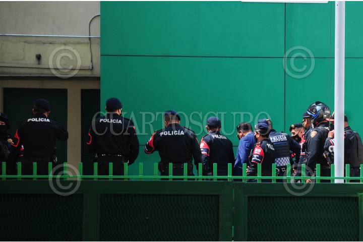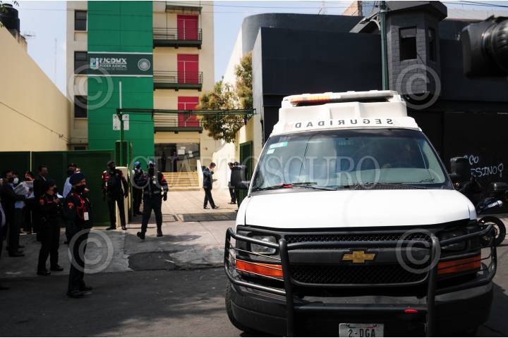 Policías custodian la llegada de un vehículo de seguridad a las instalaciones del Pjcdmx.