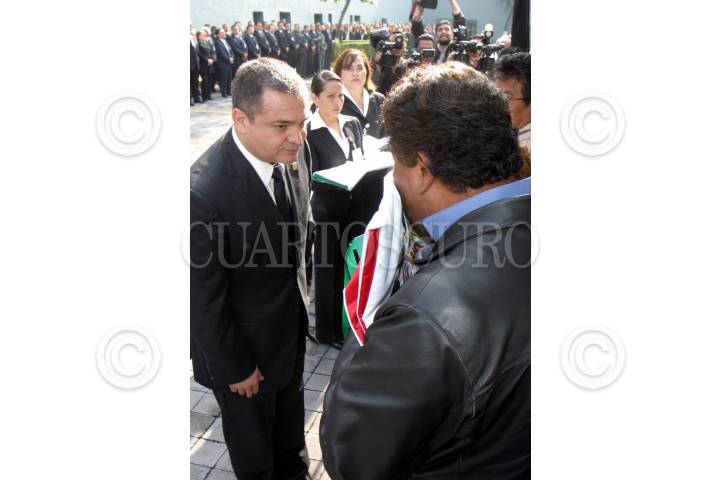 MÉXICO, D.F., 18AGOSTO2007.- Se rindió un homenaje de cuerpo presente a los agentes René Lorenzo López y Roberto Krhisna Raúl Martínez Saavedra, quienes fueron ultimados en Nuevo León; así como a Francisco Ezequiel Soberanes Escalante, asesinado en Michoacán; y a Erika Grisel Contreras García, abatida el pasado 14 de agosto en el estado de Chiapas. Genaro García Luna, secretario de seguridad pública le da sus condolencia a los familiares. FOTO:PEDRO MARRUFO/CUARTOSCURO.COM