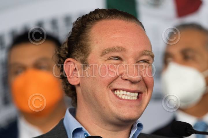 Santiago Taboada, alcalde electo de Benito Juárez; durante la conferencia de prensa tras finalizar el encuentro entre alcaldes electos de oposición y las bancadas del PRD, PRI y PAN.