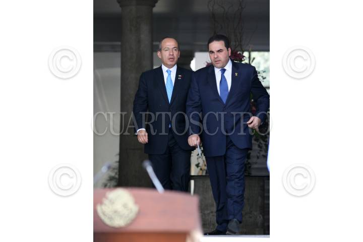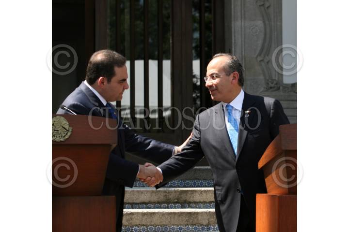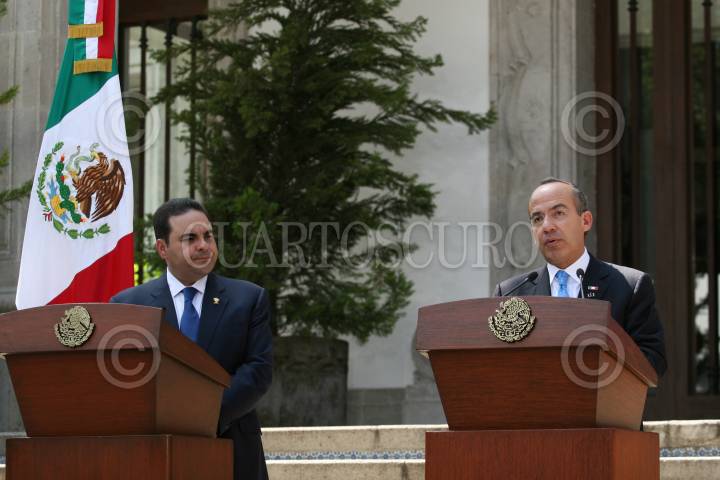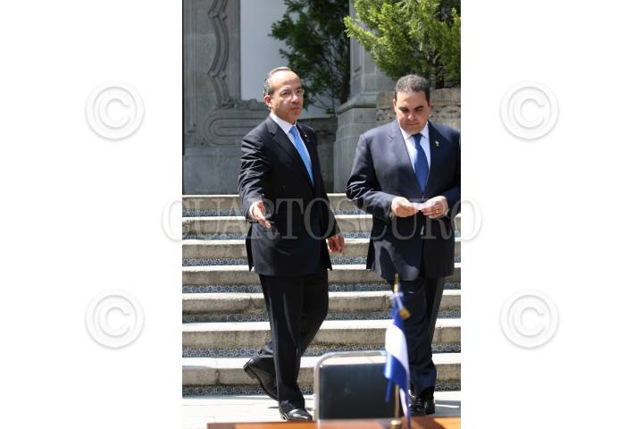 MÉXICO D.F., 15OCTUBRE2008.- El presidente, Felipe Calderón Hinojosa, acompañado de Elias Antonio Saca González, Presidente de la República del Salvador, fueron testigos de honor de la firma de convenios entre diversas dependencias de ambos paises, esto en la Residencia Oficial de Los Pinos. FOTO: GUILLERMO PEREA/CUARTOSCURO.COM