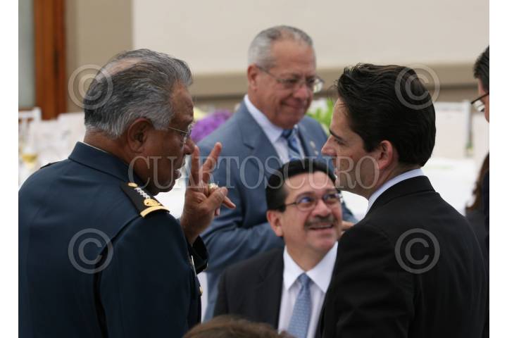 MÉXICO D.F., 15OCTUBRE2008.- El presidente, Felipe Calderón Hinojosa, en el salón Alcazar del Castillo de Chapultepec ofrecio un almuerzo en honor a Elias Antonio Saca González, Presidente de la República del Salvador, ambos mandatarios fueron acompañados por sus repectivas esposas. En la imagen, Guillermo Galván Galván, Secretario de la Defensa Nacional, hace la señal de "Amor y Paz" a Juan Camilo Mouriño titular de la Secretaria de Gobernación. FOTO: GUILLERMO PEREA/CUARTOSCURO.COM
