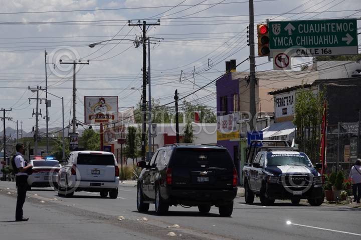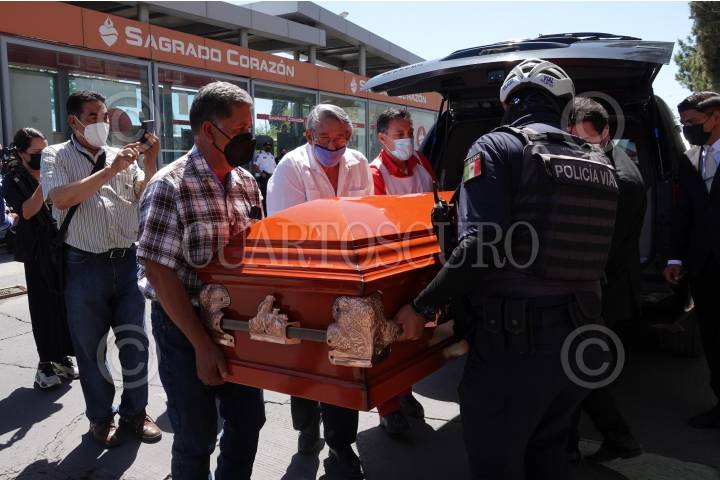 Las funerarias con los cuerpos presentes de Joaquín César Mora Salazar y Javier Campos Morales, sacerdotes jesuitas asesinados dentro la Iglesia de Cerocahui, salen de la Eucaristía en el Templo Sagrado Corazón de Jesús
