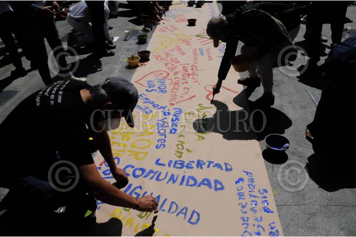 Integrantes de la organización jesuita escriben sobre un papel sus deses de paz.