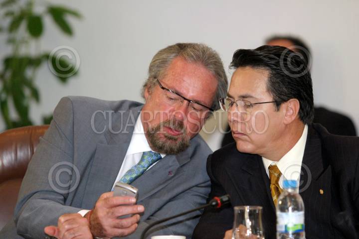 MEXICO,D.F.08OCTUBRE2007.-Se realizó una reunión de funcionarios del Aeropuerto y Servicios Auxiliares y del Aeropuerto Internacional de la Ciudad de México con Senadores. En la imagen, Héctor Velázquez Corona, director del Aeropuerto de la Ciudad de México y el senador José Julian Sacramento, secretario de la comisión de Comunicaciones y Transportes. FOTO:ROCIO ORTIZ/CUARTOSCURO.COM